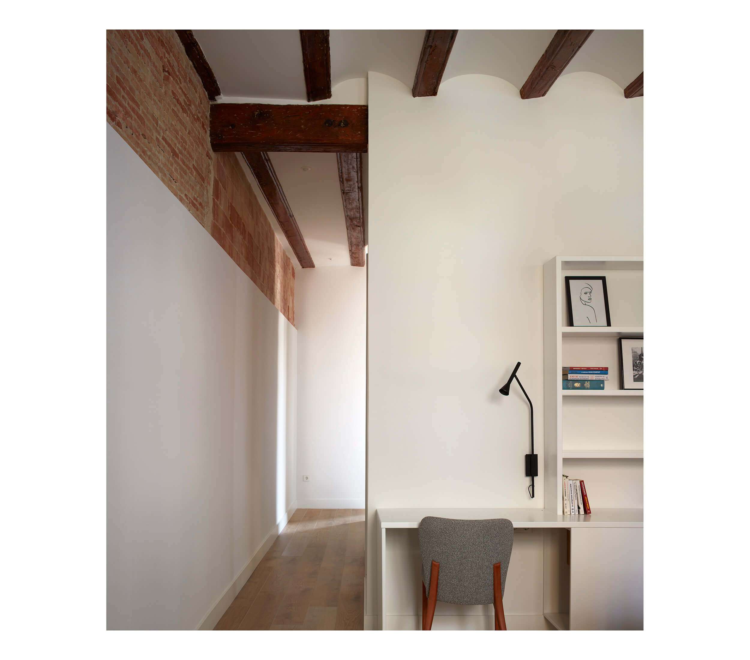 El proyecto consiste en una reforma integral de una vivienda en uno de los barrios más emblemáticos de Valencia.  El barrio del Carmen, junto a la falla de Na Jordana. Se trata de un edificio del año 1800 en el que, después de analizar la estructura original, hemos querido recuperar los elementos originales como ladrillo caravista, revoltones y viguetas de madera.