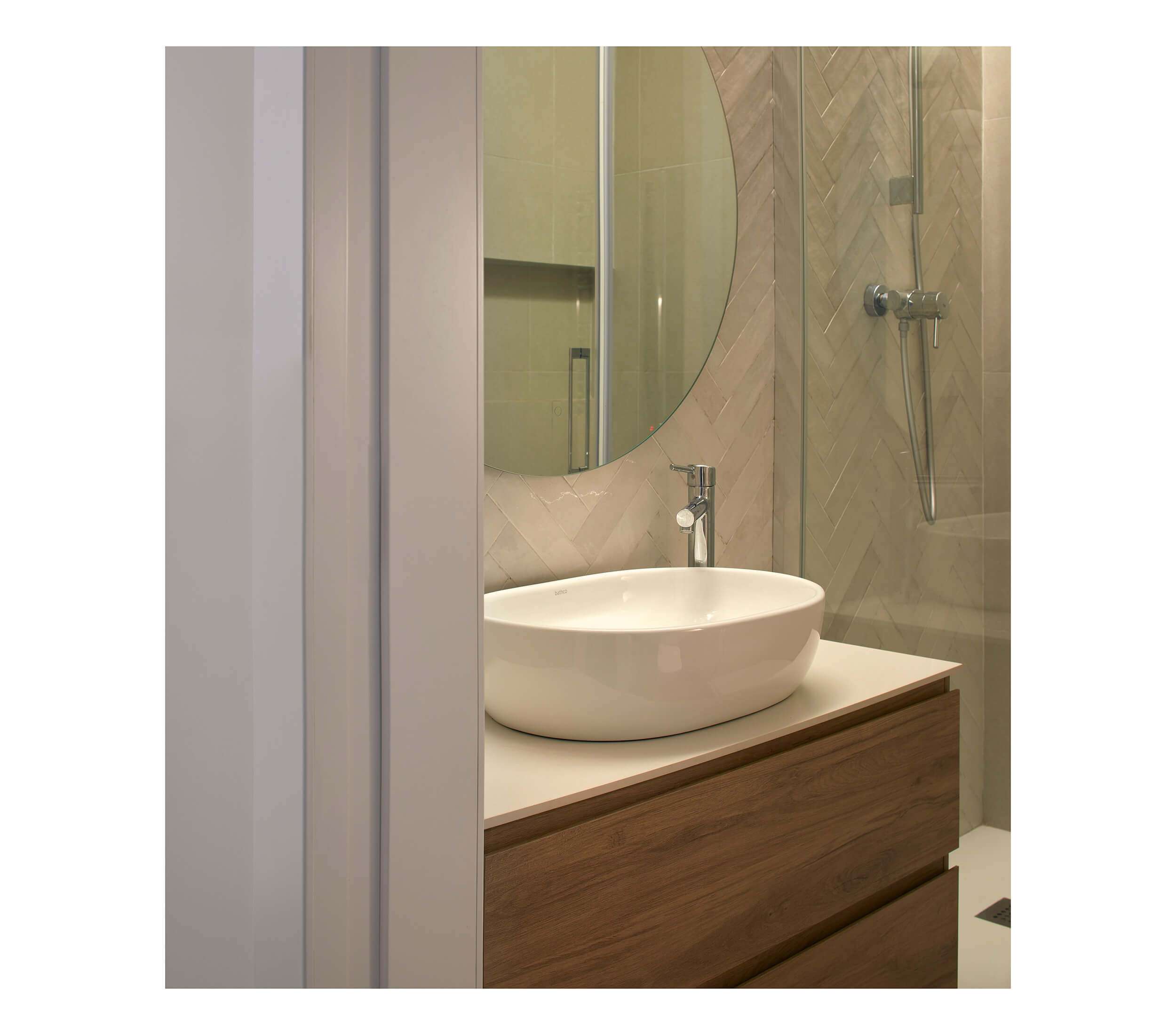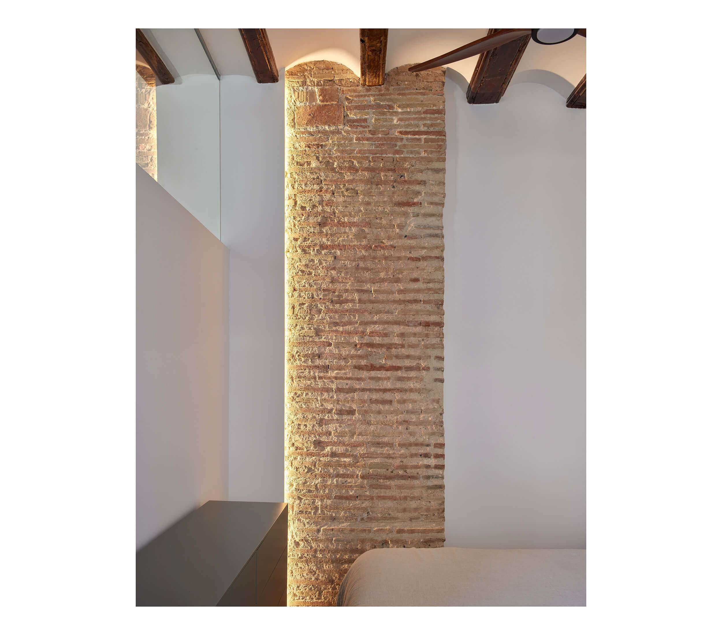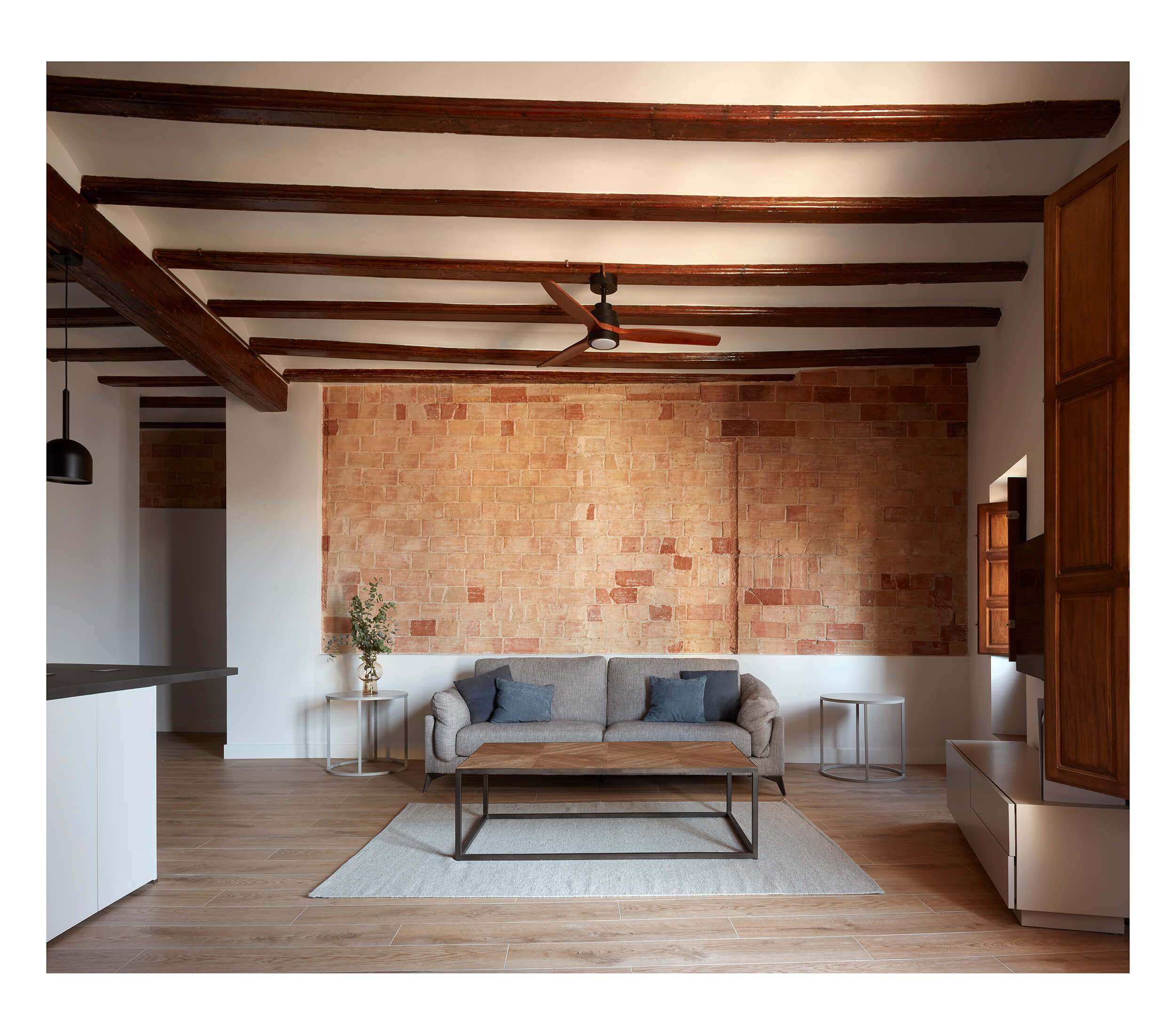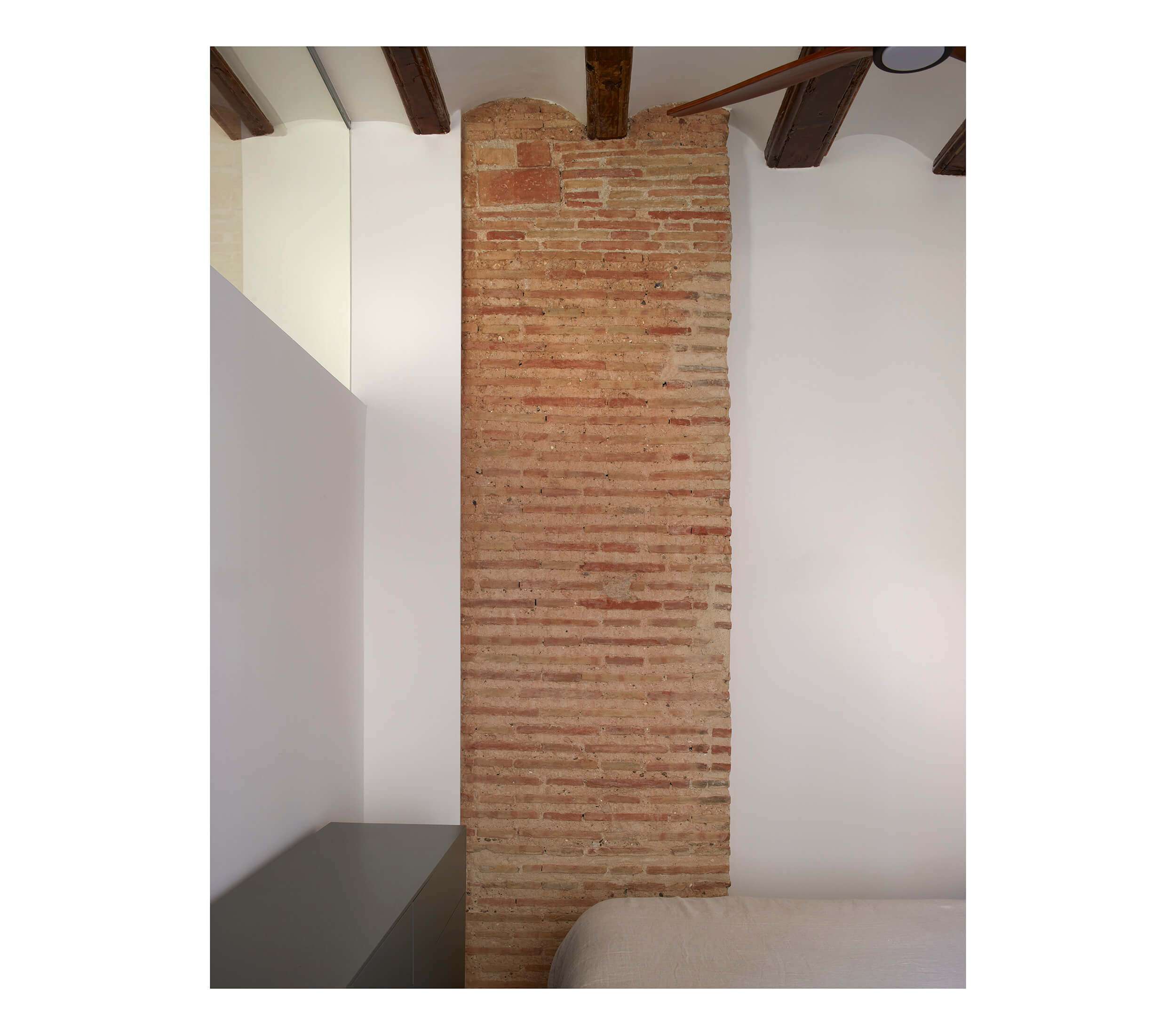 Dada la antigüedad de la vivienda hemos querido respetar la estructura y muros portantes de ladrillo que hemos limpiado y tratado para sacar el acabado original. Consiguiendo el tandem perfecto entre la estética tradicional del edificio y las necesidades de hoy en día.