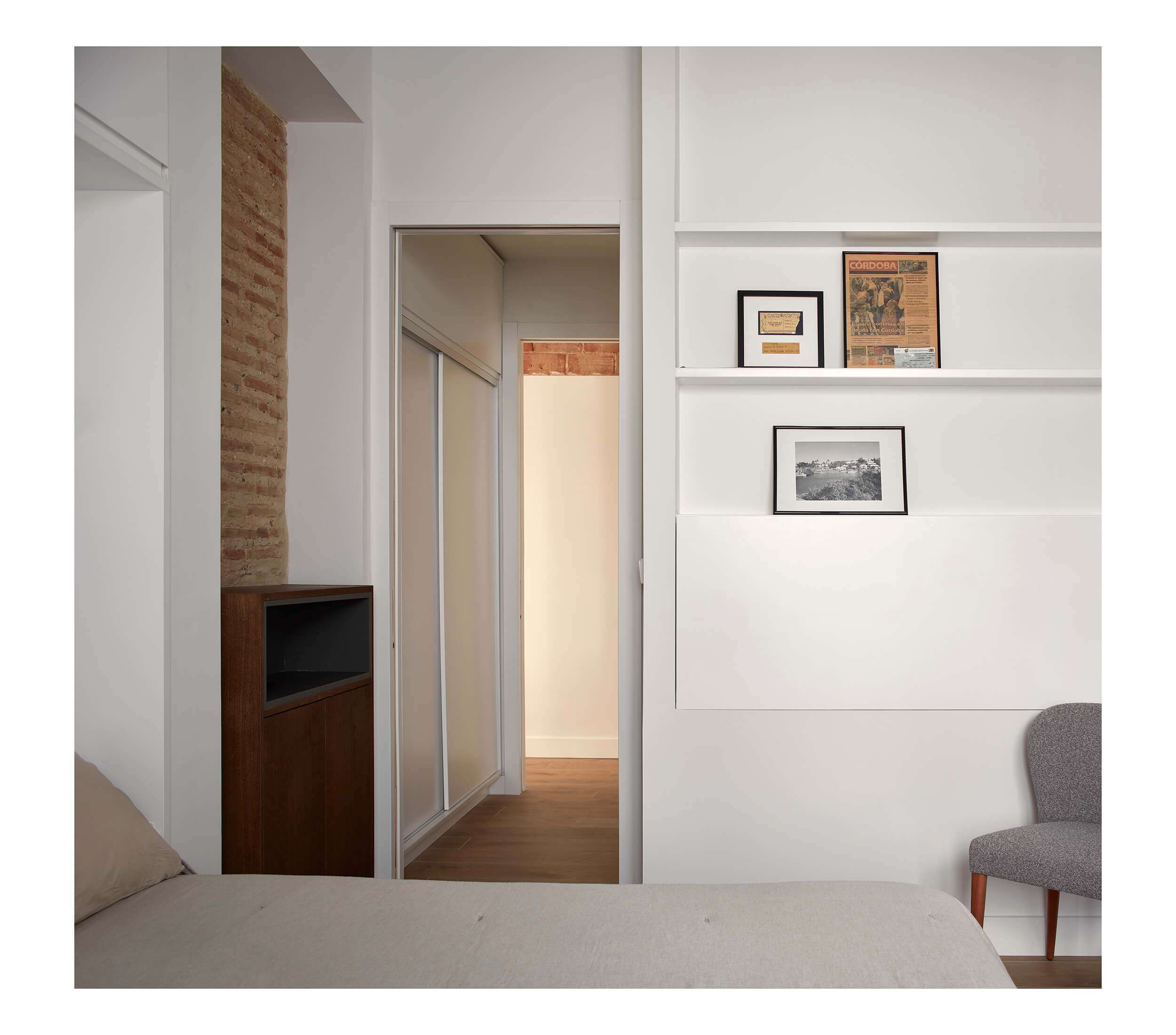 La parte superior de los tabiques está cubierta con vidrio para aprovechar la luminosidad de la fachada principal y dar ligereza al conjunto. Buscando de esta forma introducir el carácter del edificio al interior de la vivienda.