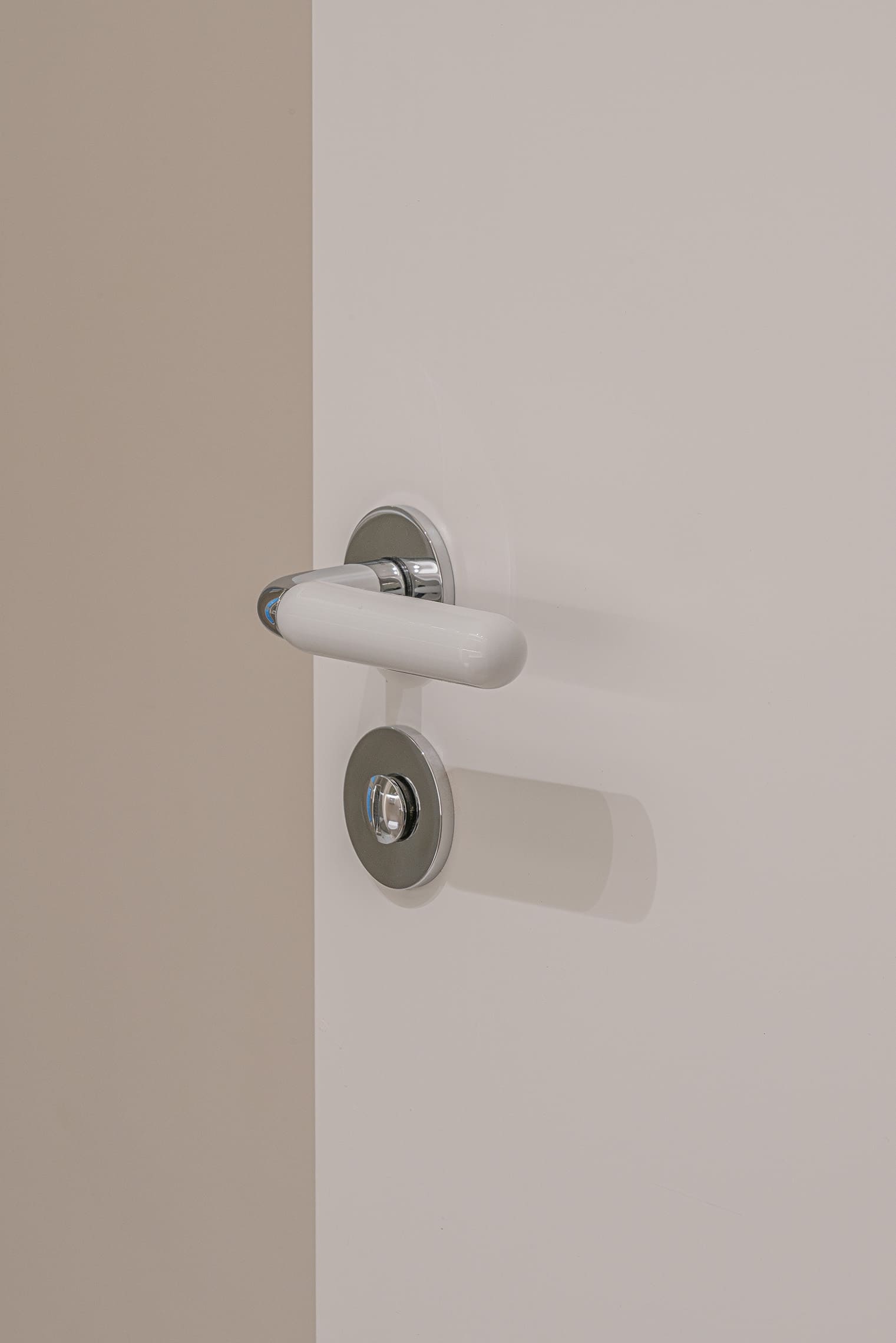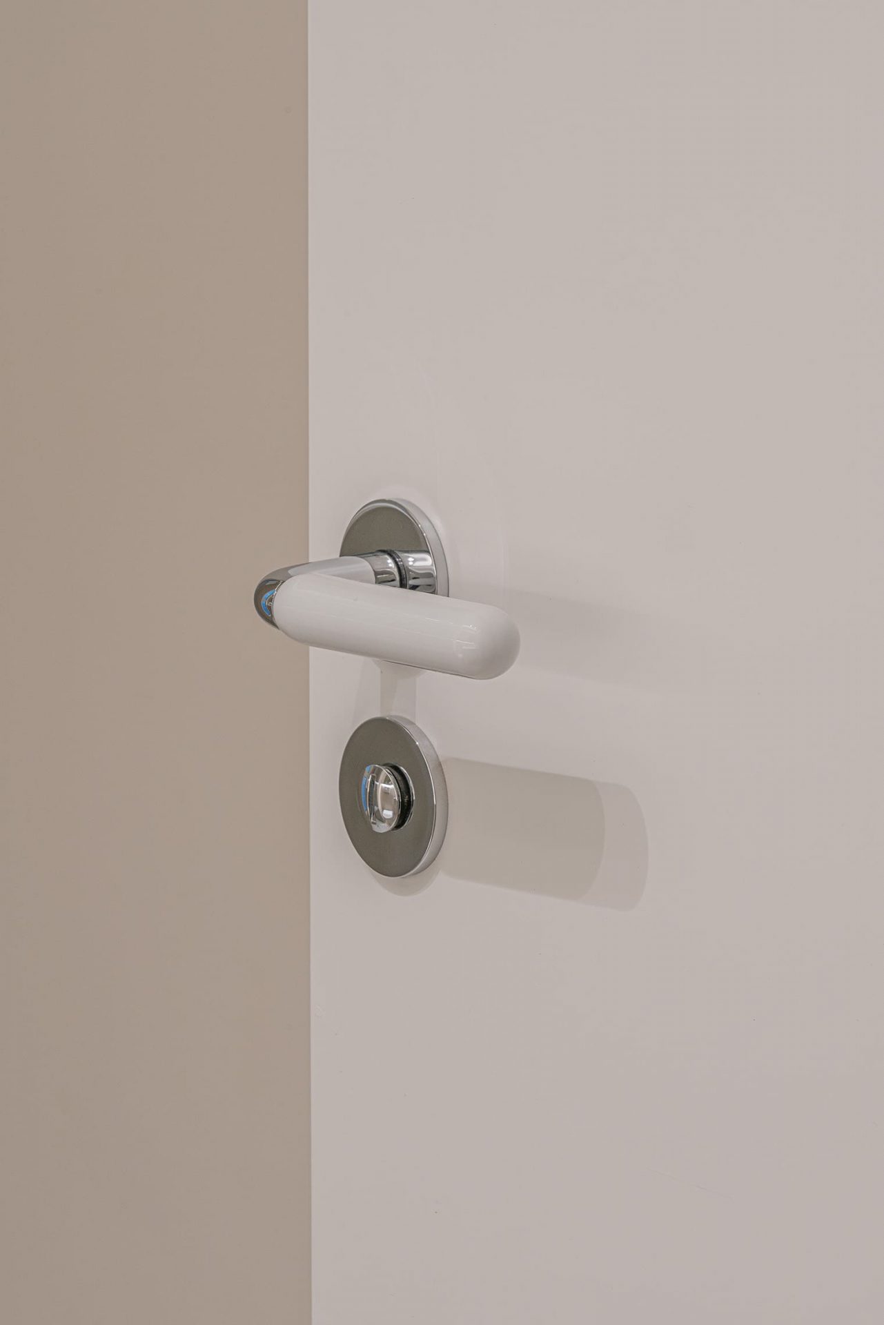 Las manivelas de Olivari en acabado porcelana y cromo aportan un toque delicado y elegante, en coherencia con el resto de la vivienda.