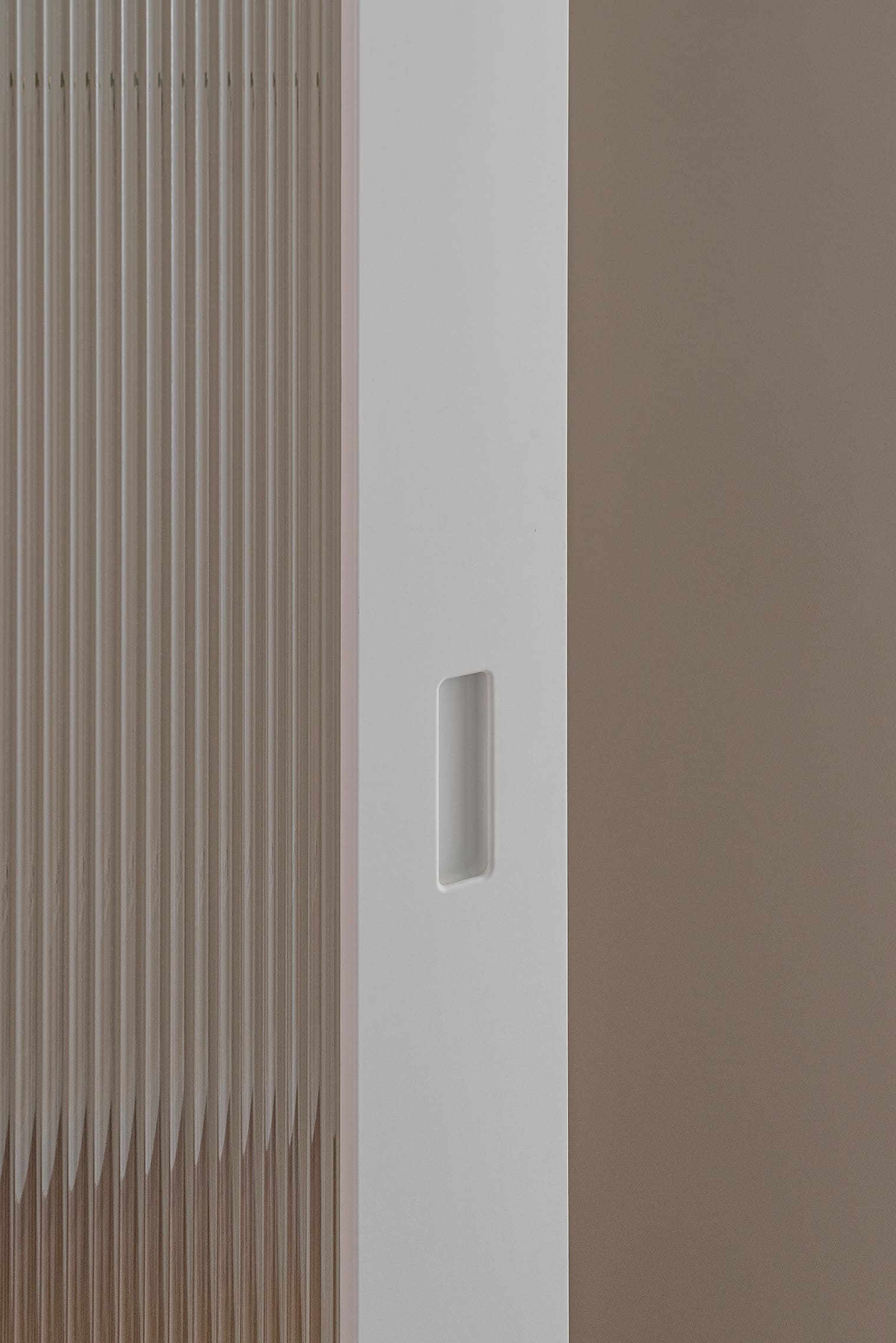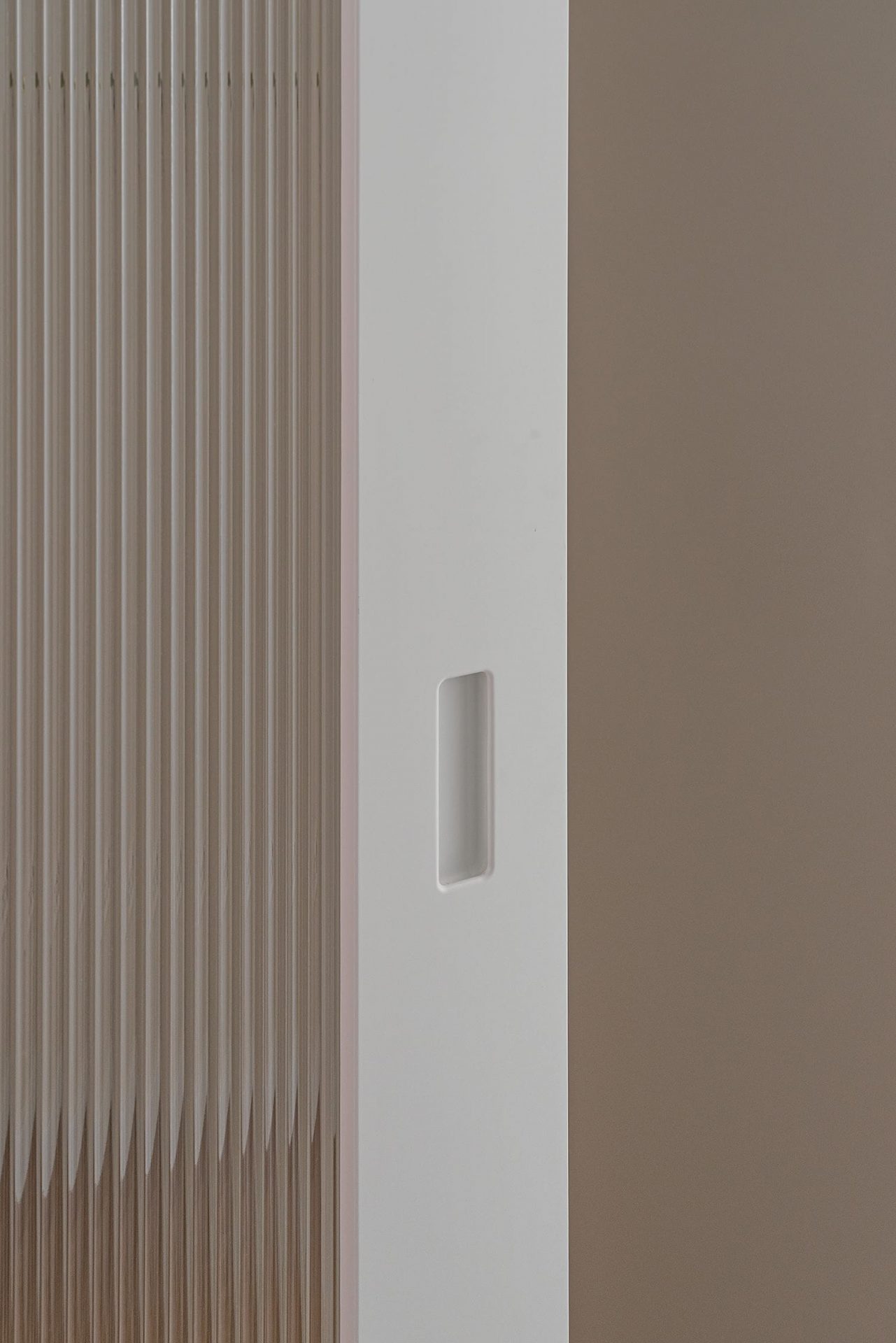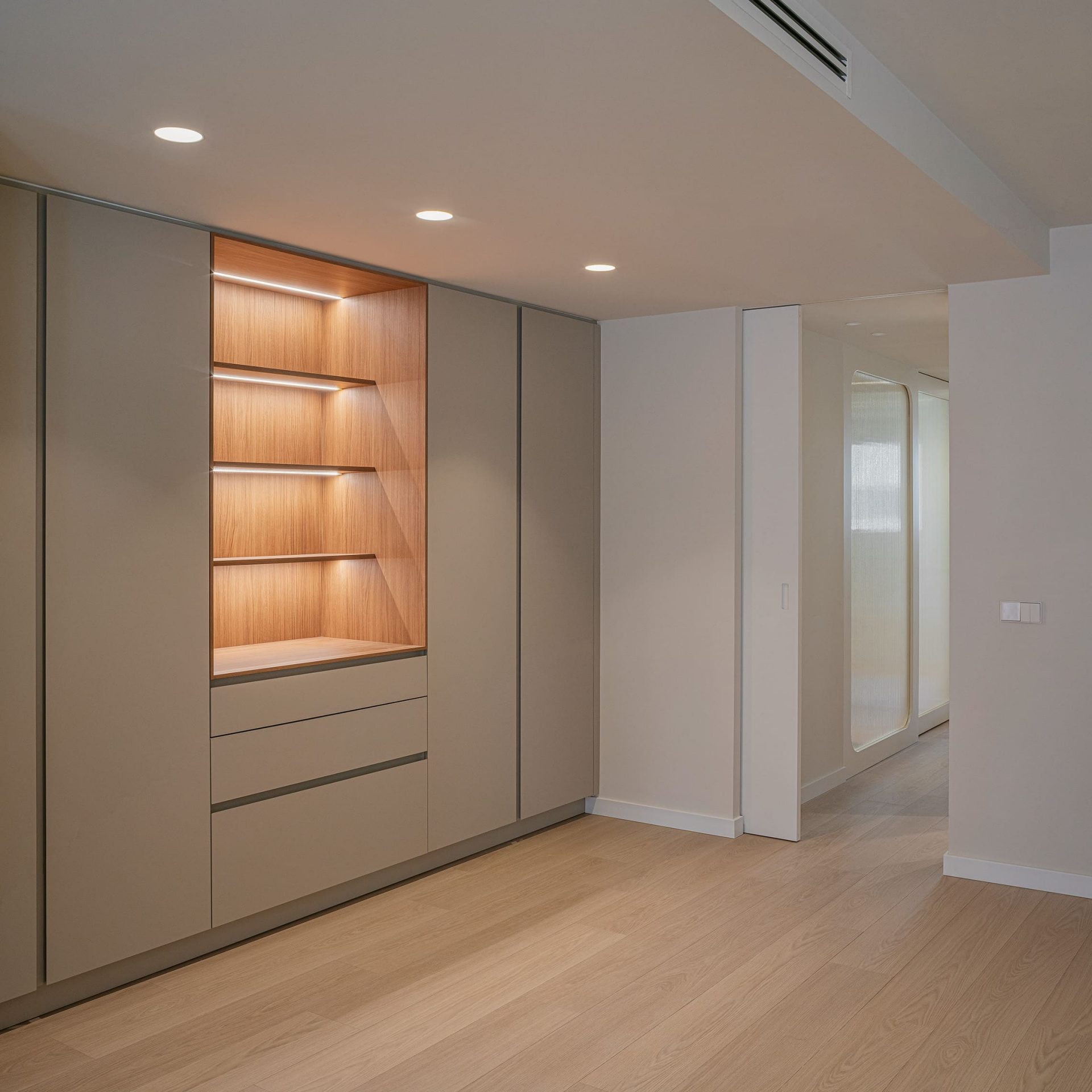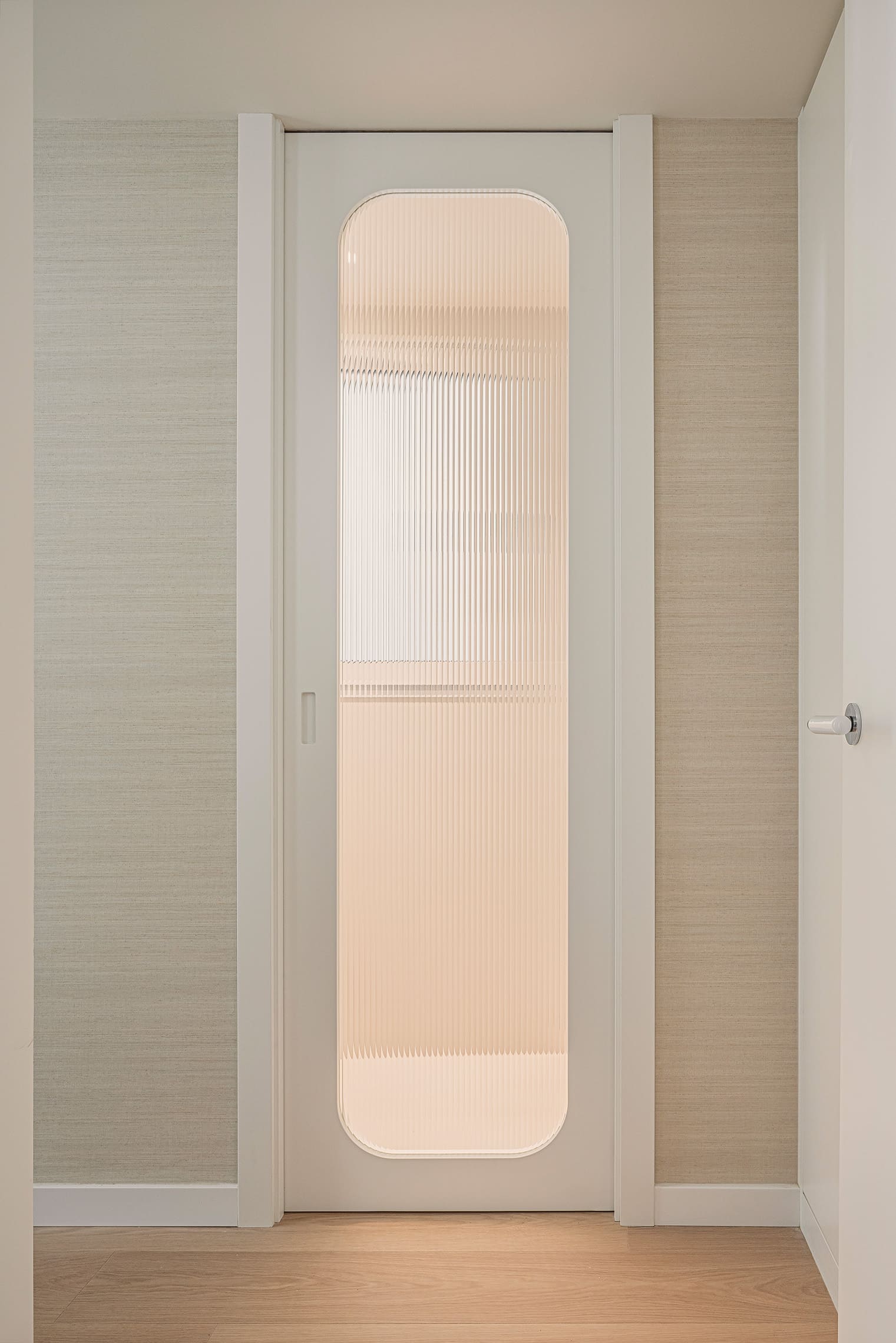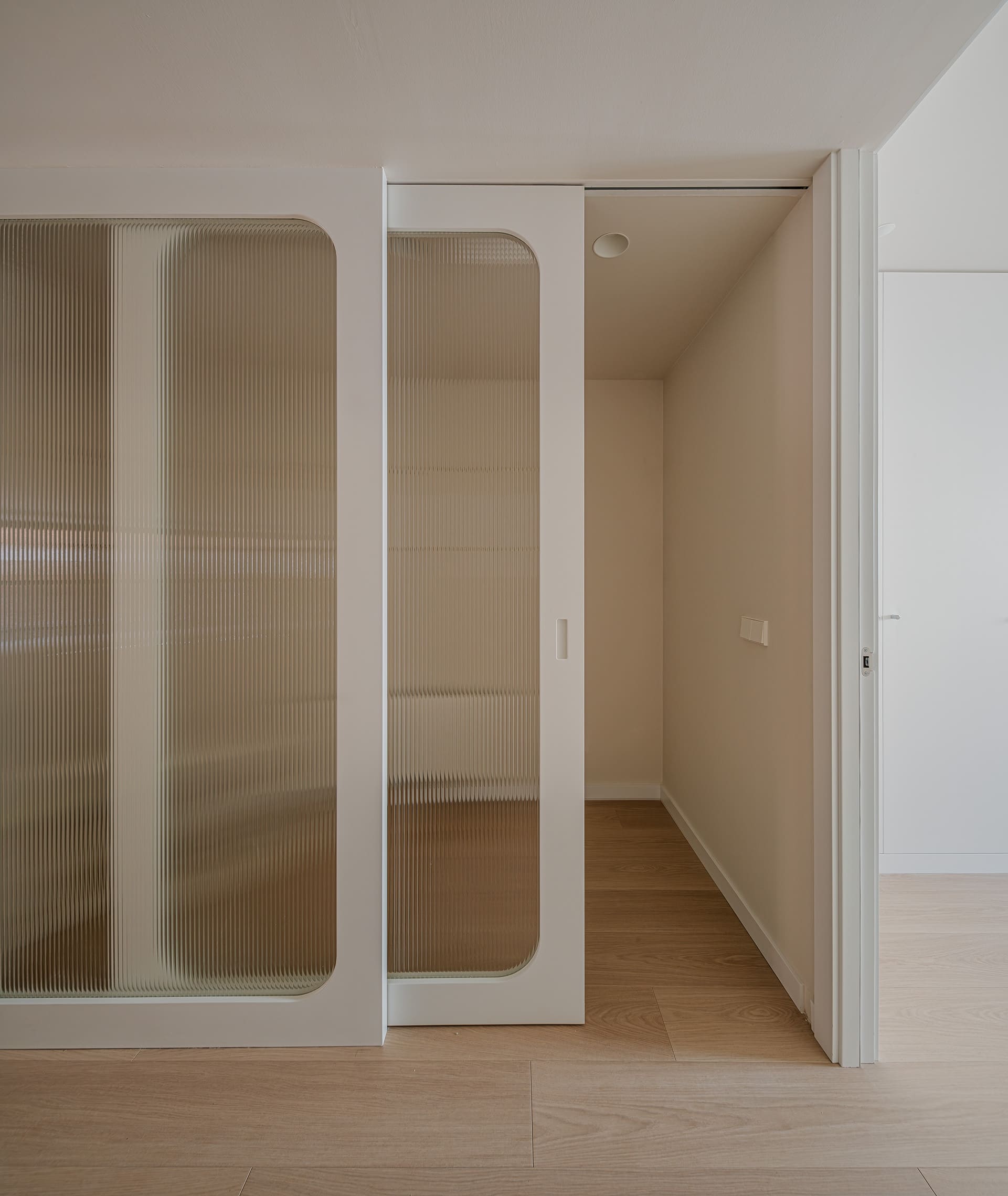 Las puertas con vidriera estriada blanca permiten el paso de la luz entre estancias, manteniendo al mismo tiempo la privacidad.