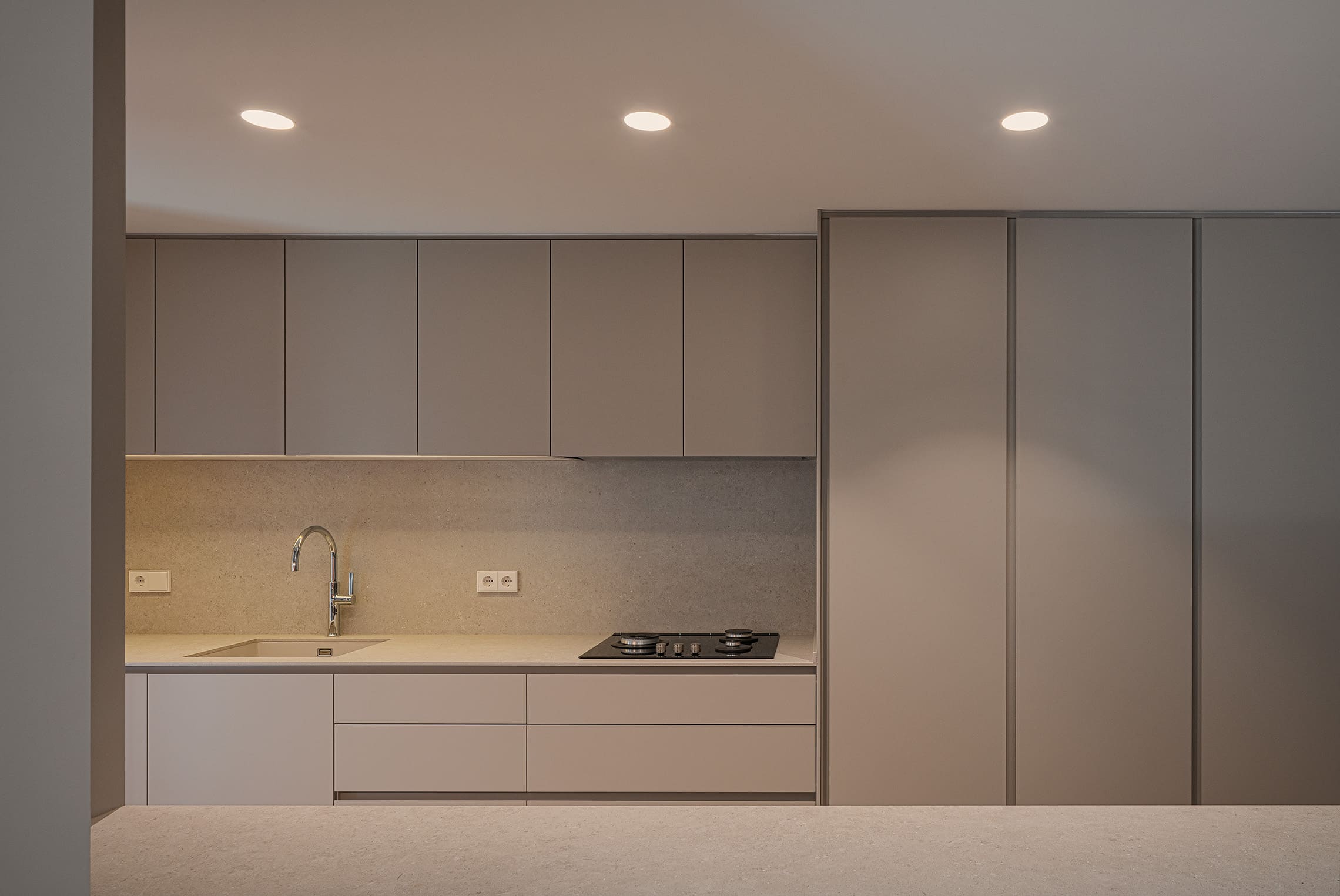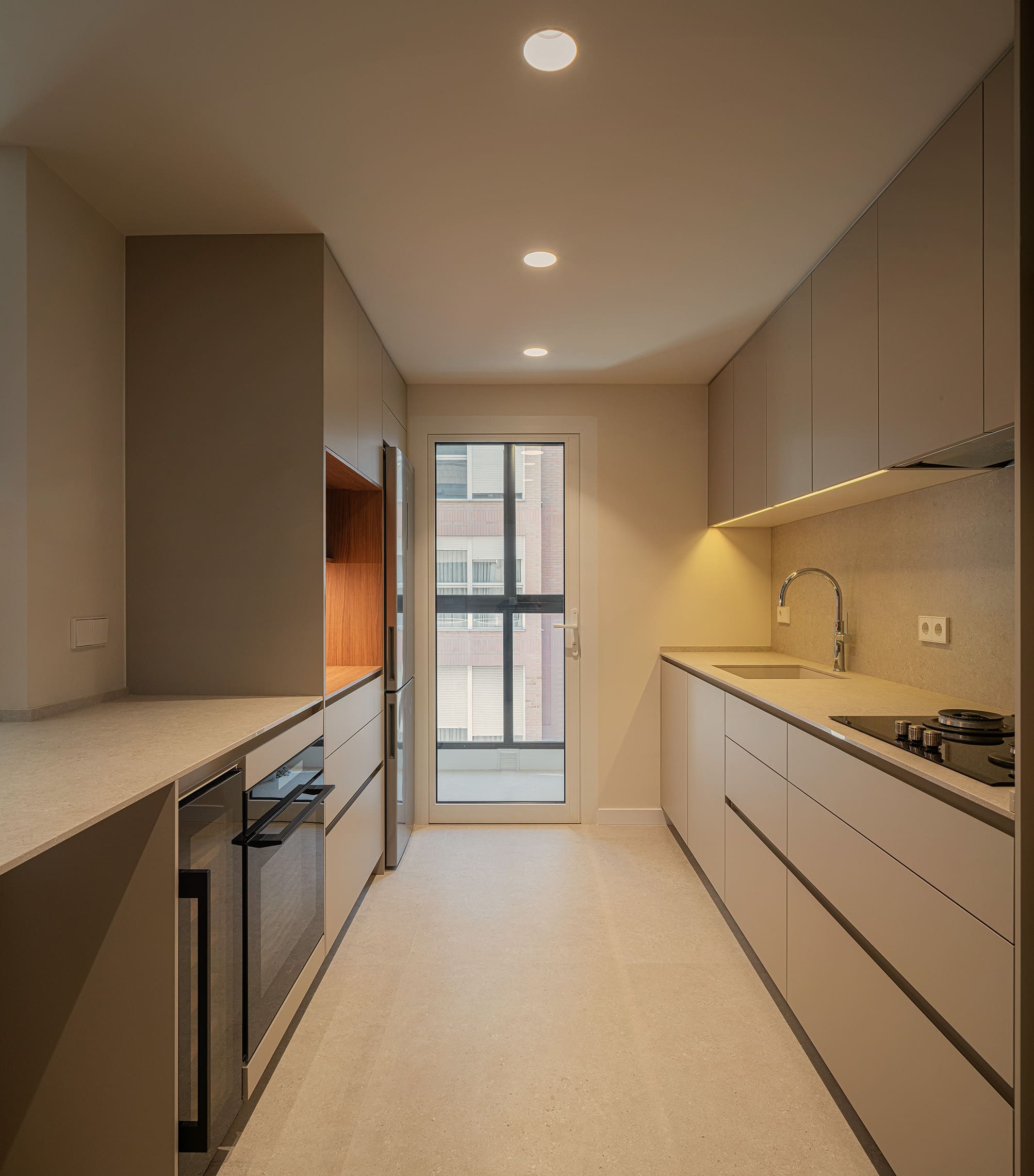 En este contexto, la cocina se integra de forma natural en el espacio principal mediante un diseño limpio y contemporáneo, donde los volúmenes se reducen a lo esencial para mantener el orden visual.